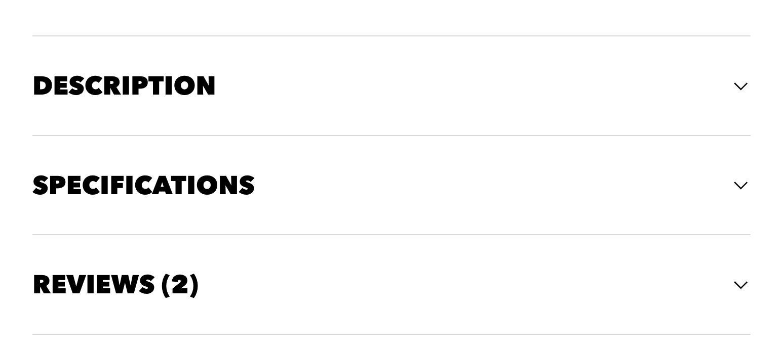 The Tabs style can be set to either Collapsible content (shown above) or Horizontal tabs, and can contain the product description, product reviews, specifications (see below) or up to three custom pages.