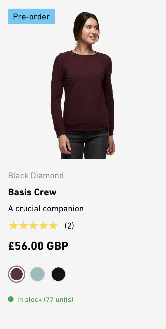 The Preorder template allows customers to purchase products that aren’t currently in stock. Products assigned to the Preorder template will display a ‘Pre-order’ label in the product card.