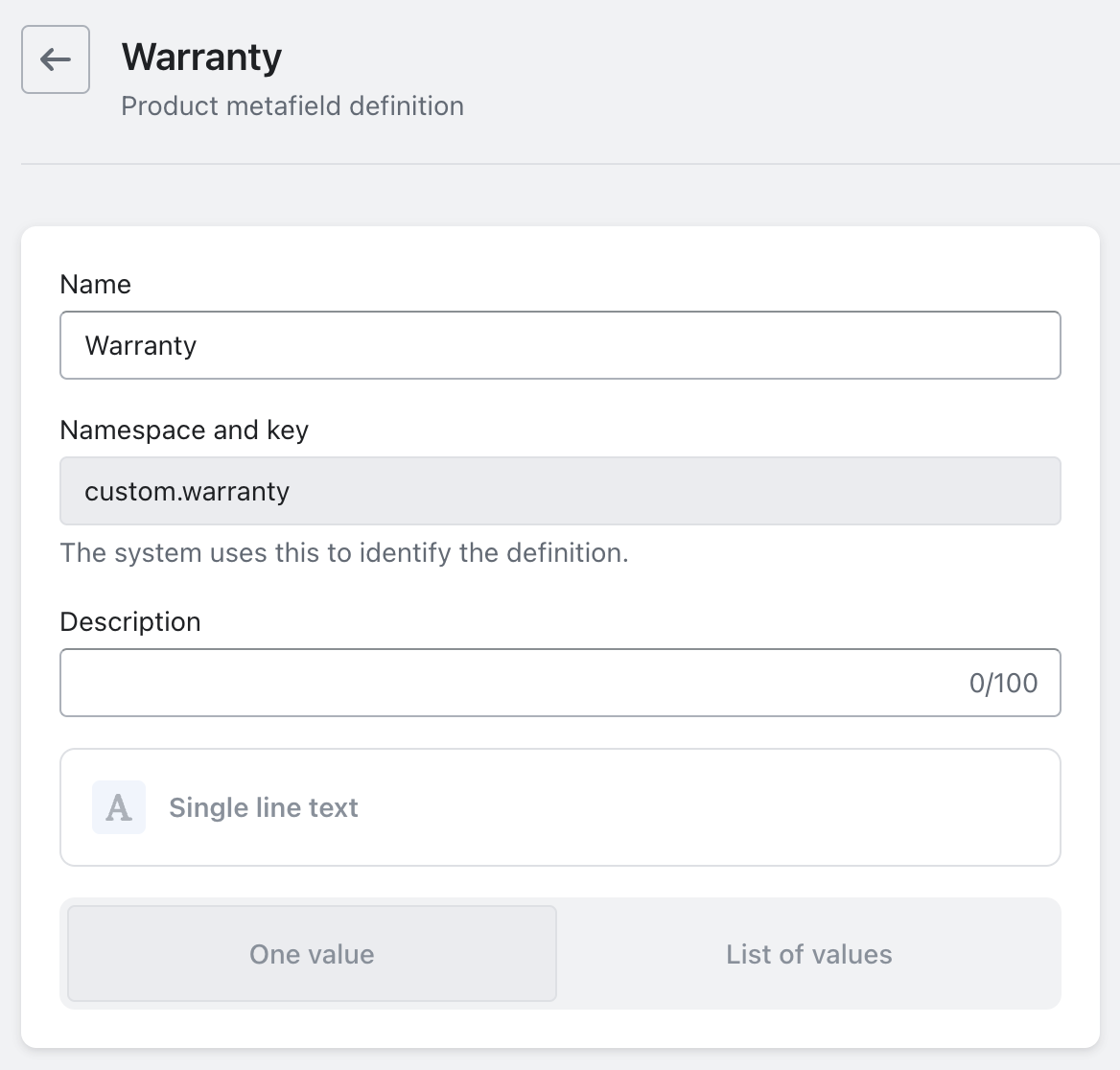 In the above, ‘Warranty’ is the label shown in the tab, and ‘custom.warranty’ is the metafield key as set in the Shopify admin area, as seen below.